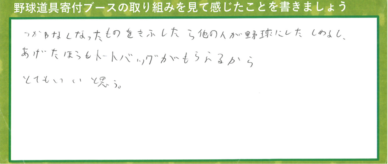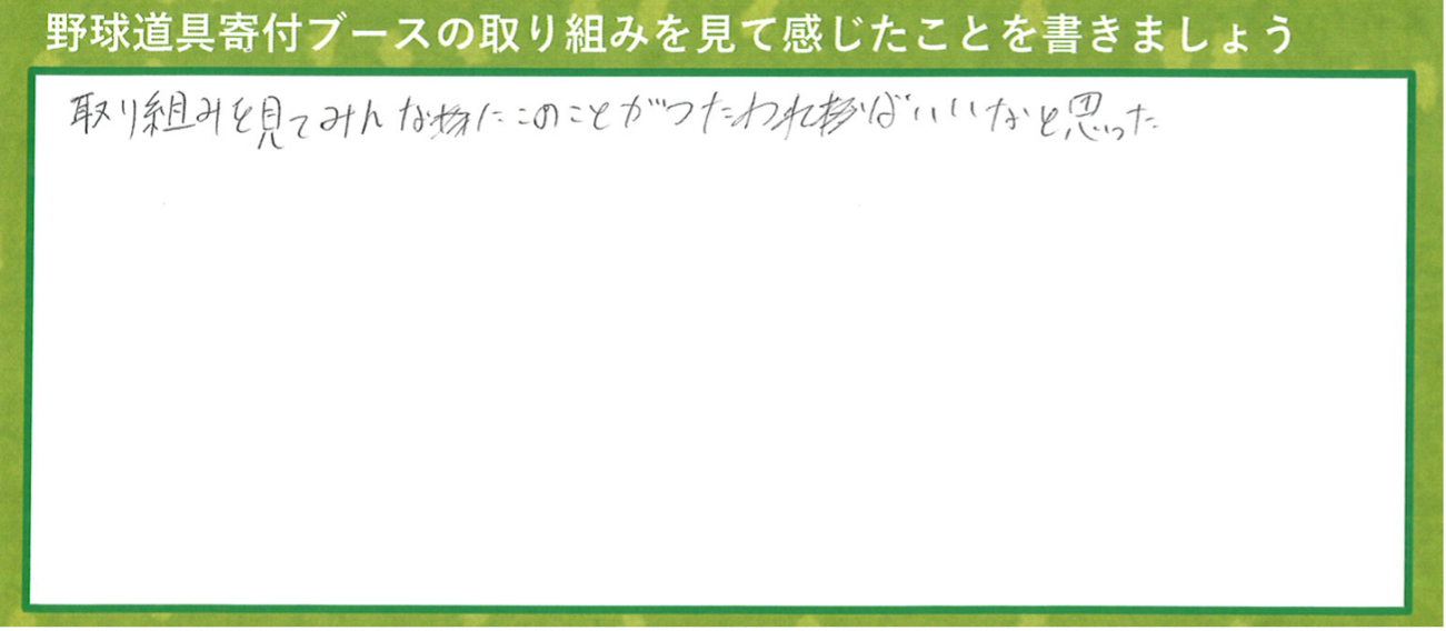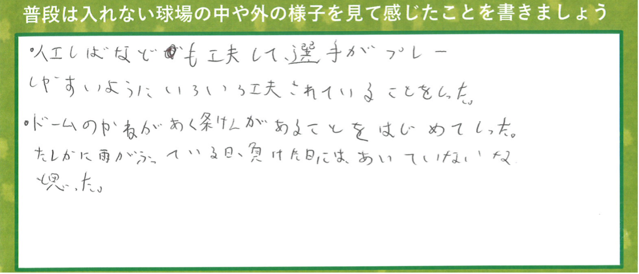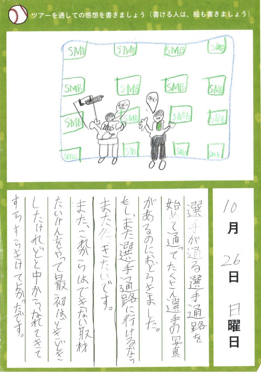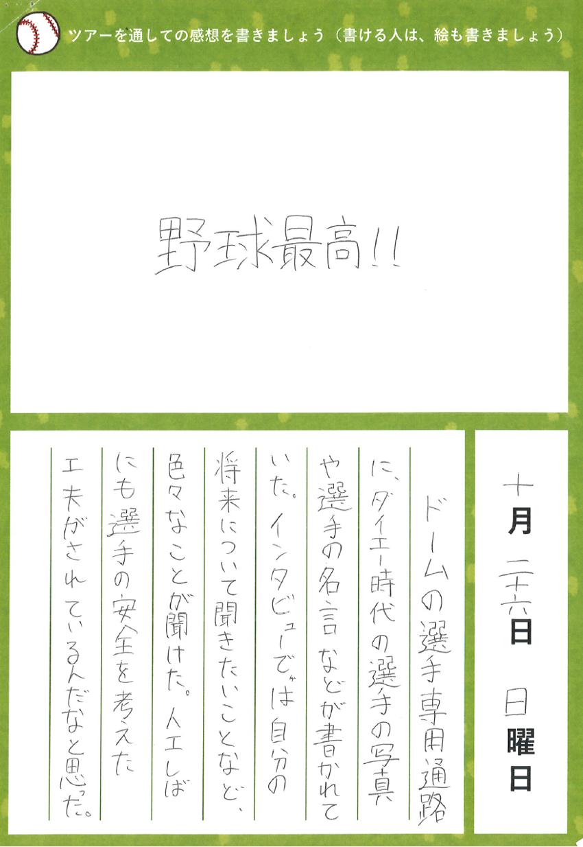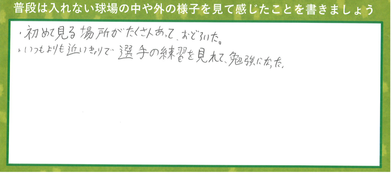イベント終了後、参加者たちに話を聞くと、「バッティング練習を近くから見れて良かった」、「選手専用通路がすごく印象に残りました。いろんな言葉が書いてあるんだなって」などの感想に加えて、「初めて取材をして、すごく緊張しました」、「球団で働いている人の話を聞けて良かった」、「インタビューするのはすごく緊張したけど、いろんな体験ができた」、さらに「将来、球団で働きたいという気持ちがさらに強くなりました」との声も聞かれた。