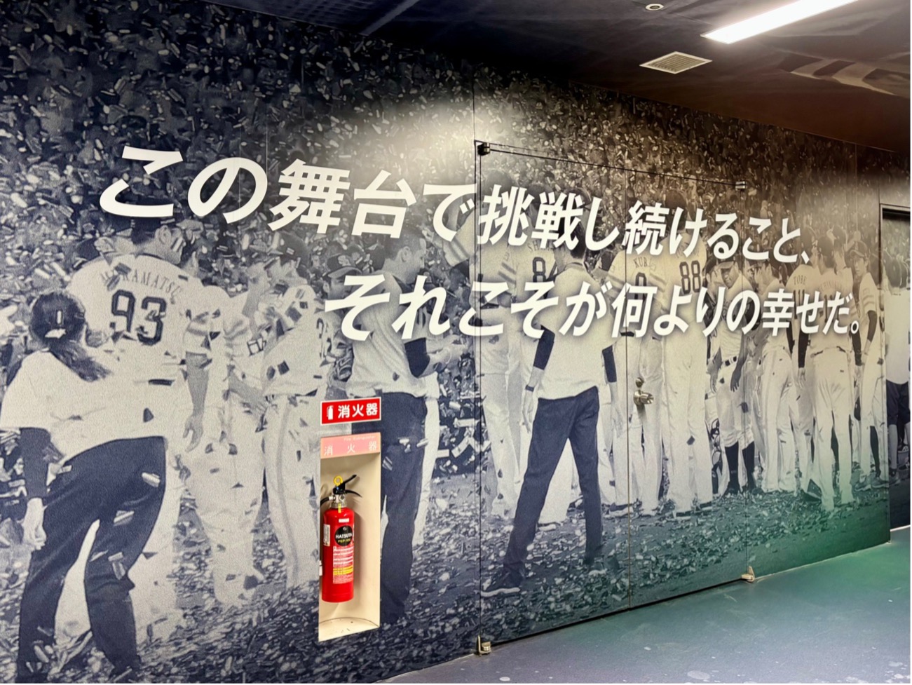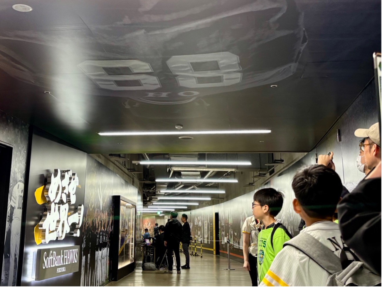 そして参加者たちは球場コンコースへ。SMBCのコーポレートキャラクター、“ミドすけ”と写真が撮れるフォトブースで記念撮影を体験した後、選手専用通路を通って球場内部へ潜入した。城島健司CBOの発案によって2025年3月にリニューアルされた通路は、選手たちが誇りと使命感を持ってグラウンドに向かえるように装飾され、頭上には王貞治会長のユニフォーム姿の背中も…。参加者たちは背筋を正し、ホークスの歴史やレジェンド選手の足跡を感じながら歩みを進めた。