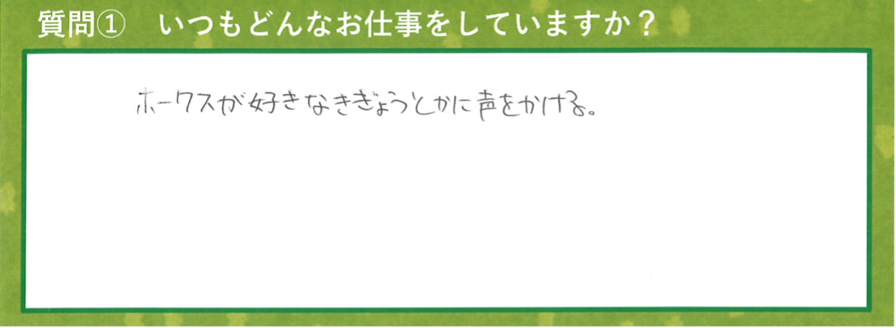 多くの人が見つめる中でのインタビューに緊張を隠せない参加者たちに対して、伊藤さんは優しい表情で返答。「今、どんなお仕事をしていますか?」、「仕事をしていて楽しいことと大変なことを教えてください」などの質問に、「ホークスを応援していただける会社さんを探しています」、「楽しいことは、大人になったら分かると思いますけど、大きい契約が取れた時ですね(笑)」、「ホークスが優勝してくれることを願っています」など、一つずつ丁寧に答え、子どもたちも感心しながら頷いていた。