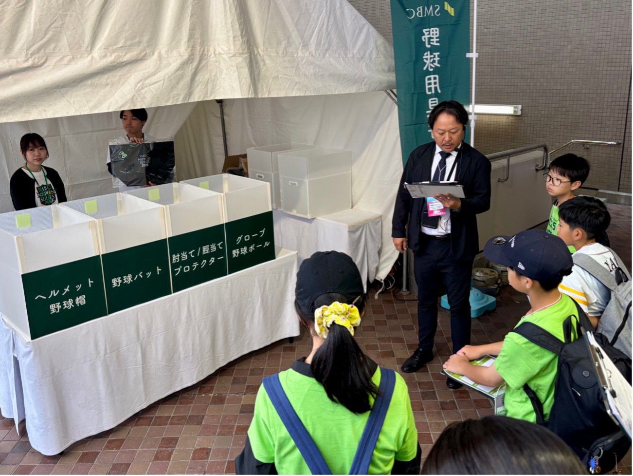 最初に訪れたのは、球場正面玄関脇に設置された『SMBC野球用具寄付プロジェクト』ブース。SMBCでは「ひとりでも多くの次世代の子どもたちへ、野球をはじめるきっかけを」を合言葉に、ファンや野球関係者から使用しなくなった野球用具(グローブ、バット、ボールなど)の寄付を呼びかけ、経済的な事由などにより野球に取り組むことが困難な子どもたちへ届ける『SMBC野球用具寄付プロジェクト』を続けており、今年の日本シリーズでもみずほPayPayドーム福岡、阪神甲子園球場(各2日間、計4日間)で実施しており、その様子を参加者が見学し、プロジェクトの趣旨に耳を傾けた。