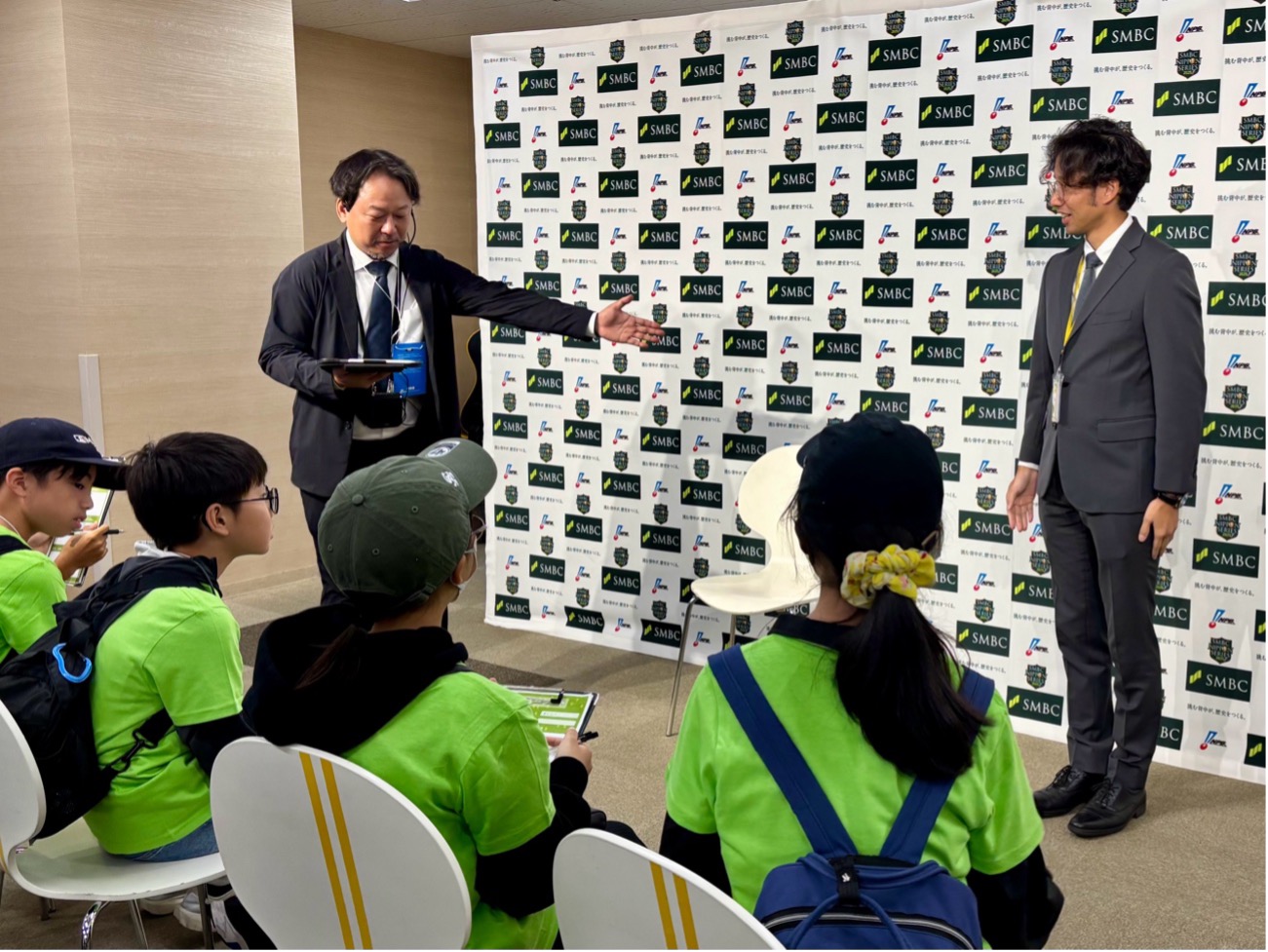 三井住友銀行(以下SMBC)では、社会的価値の創造を経営の柱の一つに据え、社会課題の解決から「幸せな成長」を目指している。その中で次世代を担う子どもたちへの教育・挑戦の機会提供を重要視し、様々な取り組みを行なっている。2014年から日本シリーズの特別協賛を続けており、協賛10年目にあたる2023年からは新たに子どもたちを対象とした新体験イベントを実施。プロ野球の日本一を決める“最高峰の戦い”の熱気を感じながら、そこで働く人たちの想いや仕事ぶりを体感し、子どもたちが記者となって取材する「記者体験」が3年連続で実施された。また、今回は大学スポーツ応援プログラム『シャカカチBOON BOON PROJECT』から、大阪体育大学4年生の3人もスタジアムツアーに参加した。