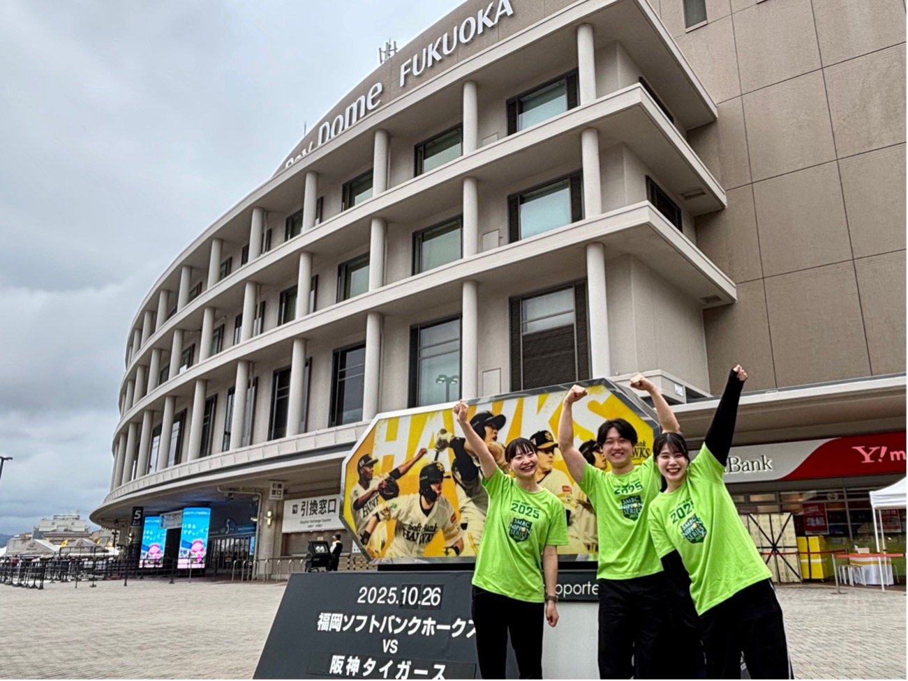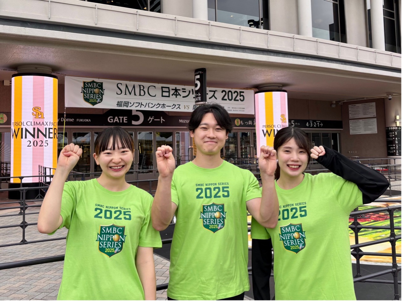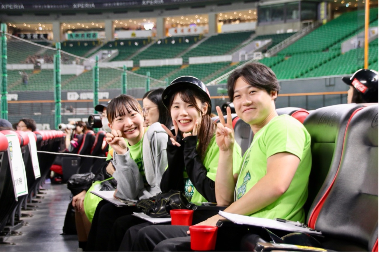 そして今回、主将の高村梨麗、髙松浩大、原田茜の4年生3人が、SMBC日本シリーズの第2戦が行われたみずほPayPayドーム福岡に足を運んだ。スポーツイベントの裏側を肌で感じ、取材などを通じて「スポーツイベントの現場」を学ぶことになった。