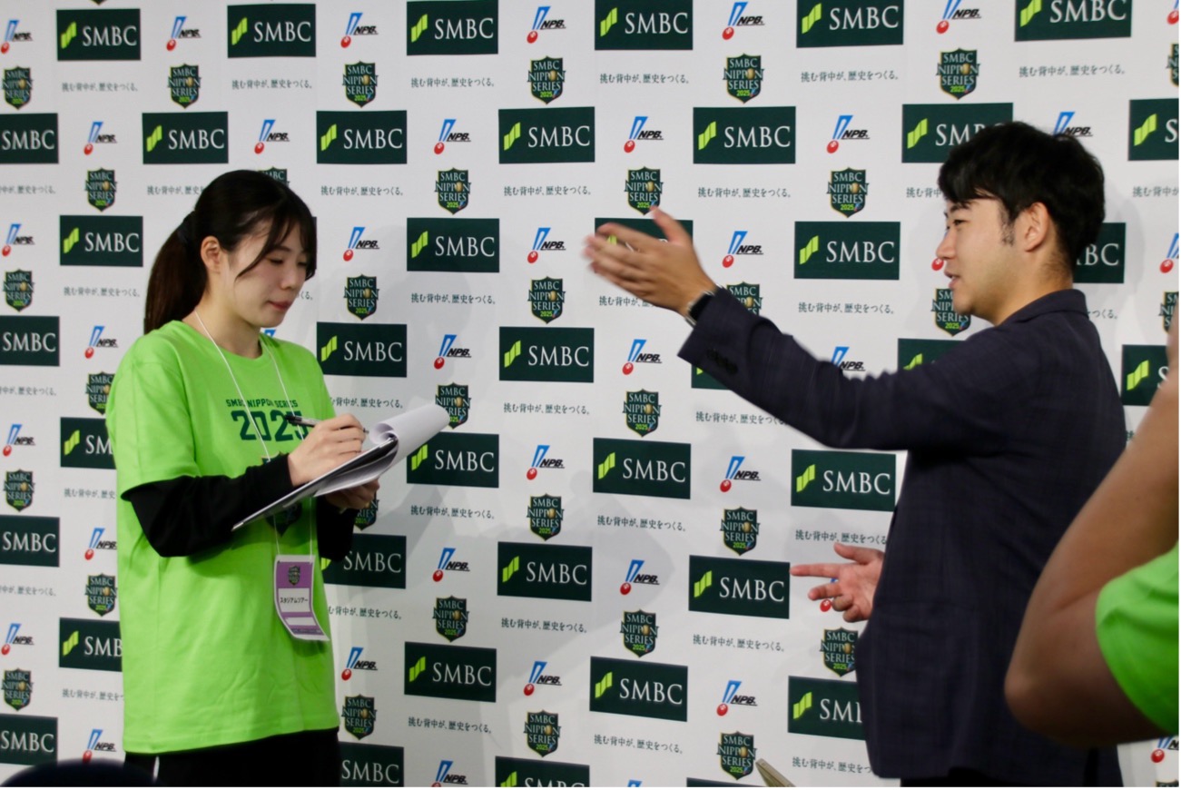 今回の来場を前に、事前にSMBCの担当者、本プロジェクトの制作チームとオンラインでのオリエンテーションを行った。そこで、SMBCが2014年以来、日本シリーズに特別協賛してきた想い、今回の取り組みのテーマや趣旨、取材の際の心得などを学び、準備を進めてきた。