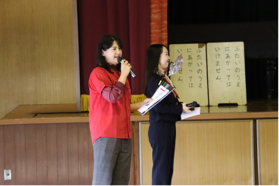 講師役を務めたのはJERAの出町由佳さんと小出有華さん。広島県出身でカープファンの小出さんは新井貴浩監督のレプリカユニフォームを着て授業を行った。
