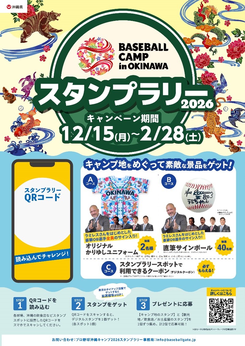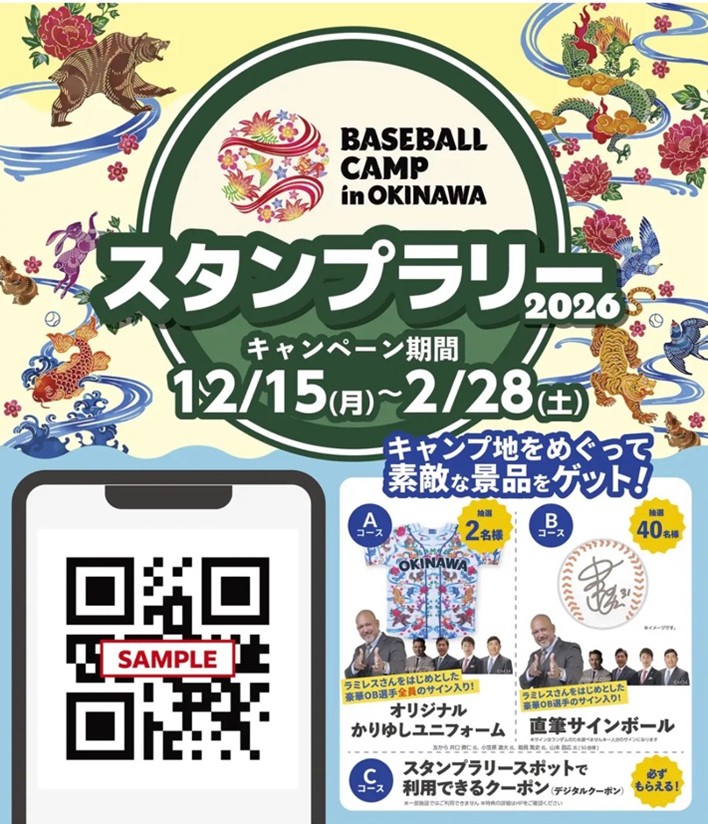 実施期間は2025年12月15日(月)~2026年2月28日(土)まで。参加者はプロ野球球団(NPB球団の1、2軍、韓国球団)の沖縄キャンプ地17球場に加えて、その周辺の観光地や飲食店、土産店などの各所スポットに掲示されたポスターにスマートフォンをかざしてQRコードを読み取り、デジタルスタンプを集めることで特典をゲットできる。