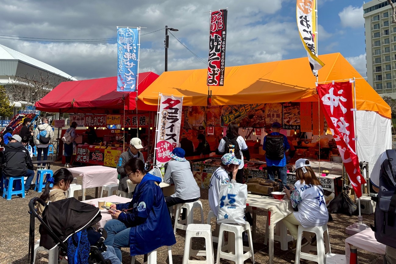 宜野湾キャンプは、その宜野湾海浜公園の敷地の広さもあって、平日は“ちょうどいい感じ”の混み具合となっている。2月前半の午前中は海風がまだ冷たく、長袖に加えて上着も必要だが、昼間になれば南国の太陽が降り注ぎ、2月中旬以降になればさらに暖かくなる。ファンたちは練習見学の合間に、市立体育館横のグルメコーナーで腹ごしらえ。多目的広場ではキャッチボールを楽しんでいるファンの姿もあり、そのまま風上を目指して歩けば美しいトロピカルビーチも“すぐそこ”の位置にある。ベイスターズファンはもちろんだが、アクセス面も含めて、他球団のファンの方が“少し覗いてみる”のもおすすめだ。