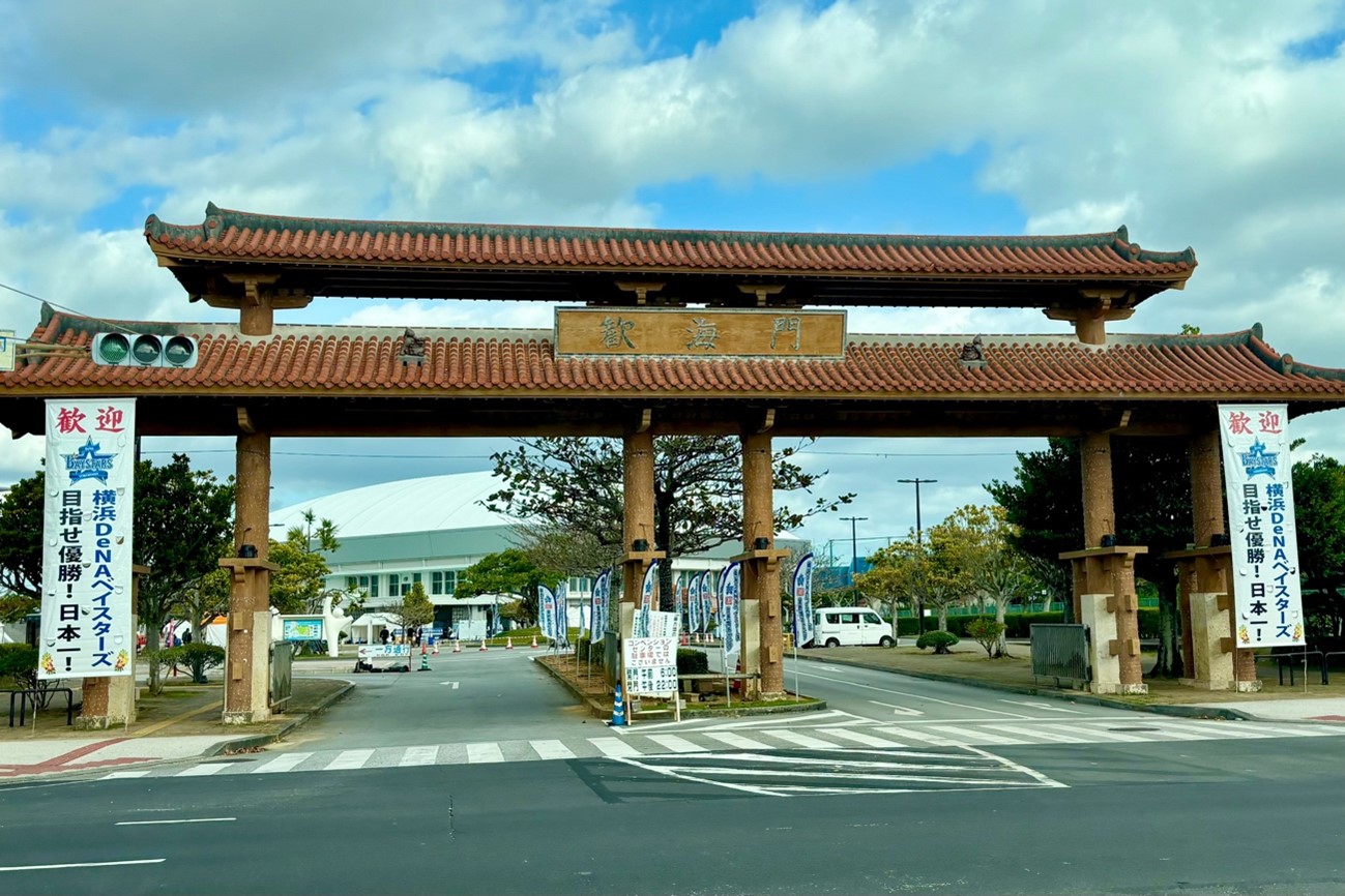 1987年から始まり、今年で節目の40年目を迎えたDeNAの宜野湾キャンプ。ユニオンですからスタジアム宜野湾(宜野湾市立野球場)は、那覇空港から車で約30分、西海岸沿い、大規模なコンサートや国際会議が開かれる沖縄コンベンションセンターもある宜野湾海浜公園内にある。那覇からのアクセスもしやすく、400台以上が停められる無料駐車場が隣接されており、今年もキャンプ初日から多くのファンが訪れている。
