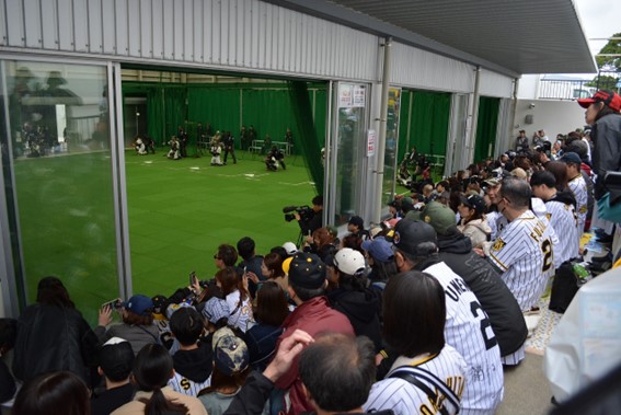 メイン球場では主に野手陣が汗を流し、打撃練習では選手が柵越えを披露するたびに拍手が沸き起った。ブルペン観覧は競争率が高く、この日は才木浩人や村上頌樹の投球練習を一目見ようとファンが殺到。サブグラウンドにも観覧スペースが用意されており、こちらはゆっくりと選手の練習を観察することができた。