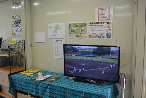 休憩スペースでも球場の様子が見られる。こちらにスタンプラリーのポスターが掲示されている