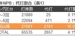 昨季NPBでは計2672回の代打起用が行われ、のべ266選手がピンチヒッターとして打席に立った。代打が占める打席の割合は全体で見ると4.1%にすぎないが、7回以降は10.0%となり、試合のカギを握る重要な役回りといえるだろう(表1参照)。今回は、代打のデータを見ていきたい。