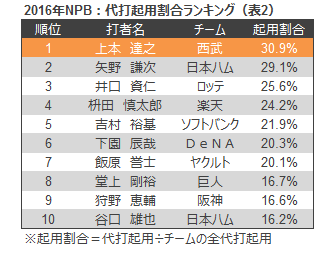まず2016年のチーム全体の代打起用割合を、選手個人別に算出した。トップだったのは、上本達之(西武)の30.9%。以下、矢野謙次(日本ハム)や井口資仁(ロッテ)ら、経験豊富なベテランが上位に名を連ねていた(表2参照)。彼らは“代打の切り札”と形容されることも多く、ここぞという場面で首脳陣が自信を持って打席に送る存在。この数字は、監督やコーチの信頼度といって良いかもしれない。