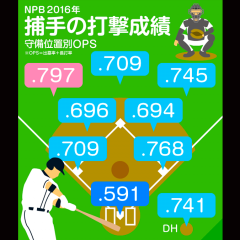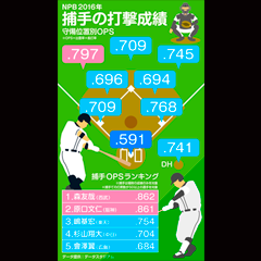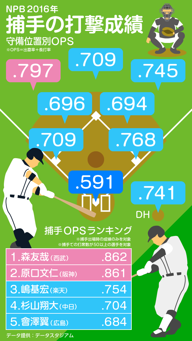 「グラウンドの指揮官」とも表現される捕手のポジションは守備力が優先され、打力は二の次とされがちだ。打撃成績を守備位置別に見ると、その実情は鮮明になる。2016年シーズンにおける捕手の平均打率は.226。出塁率+長打率で計算され、打率よりも得点との相関が高いOPSは.591で全ポジションの中で最低。2番目に低い二塁手とも.100以上の差をつけられている。この3年間の捕手のOPSは.500台に低迷しており、“打てる捕手”の不在は球界全体の課題となっている。